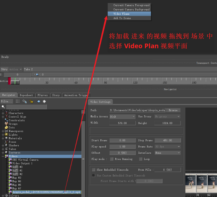 如上图,在 MotionBuilder 场景中有个面片模型显示参考的视频。