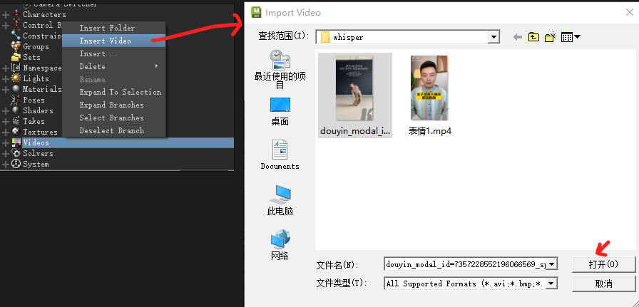 先将 视频文件 加载进 MotionBuilder ,如下图,选择 Videos - Insert Viode 然后选择视频文件即可。