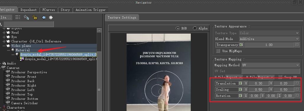 选中创建的 视频平面,找到材质贴图设置,如下图。