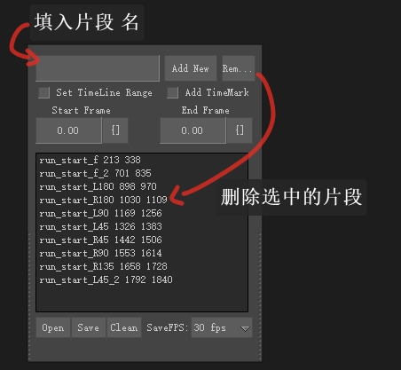 | AddNew | 填上 动画片段名,设置 片段起始帧,结束帧,点击 创建书签 |