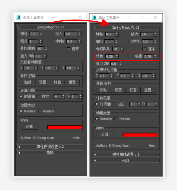 - 当 惯性 大于零时,余摆参数有效果,同时弹性参数需重新设置(比1.7版本加 0.15 左右)。