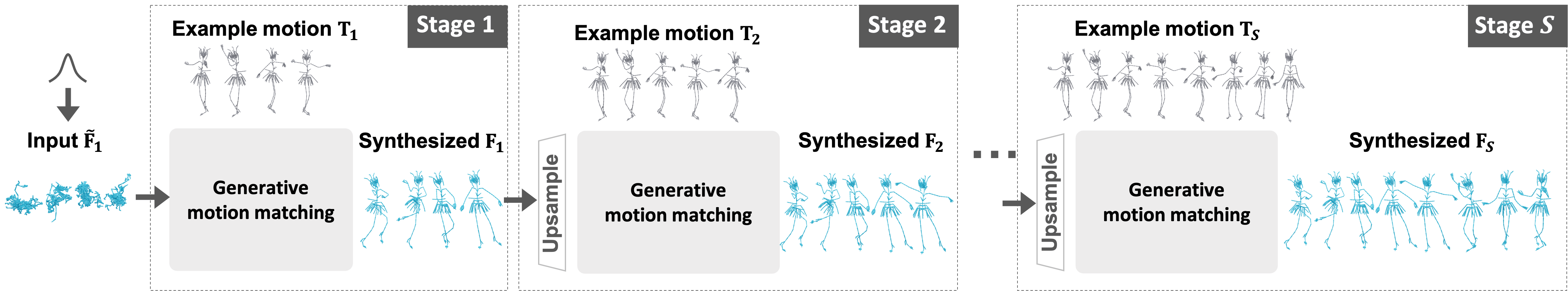 我们的生成框架的核心是生成运动匹配模块,它利用双向视觉相似性作为运动匹配的生成成本函数,并在多阶段框架中运行,以使用示例运动匹配逐步完善随机猜测。